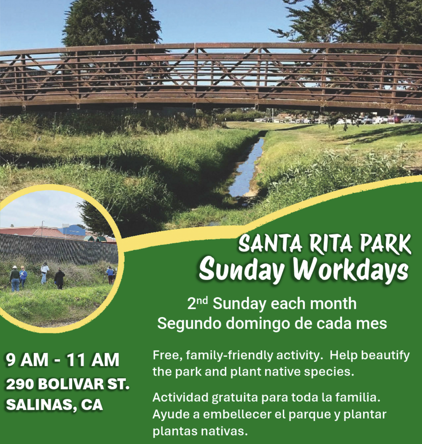 Join the Santa Rita and Bolsa Knolls Watershed Group for a Work Day on the 2nd Sunday of the month from 9 am to 11 pm at Santa Rita Park, 290 E. Bolivar Street in Salinas.