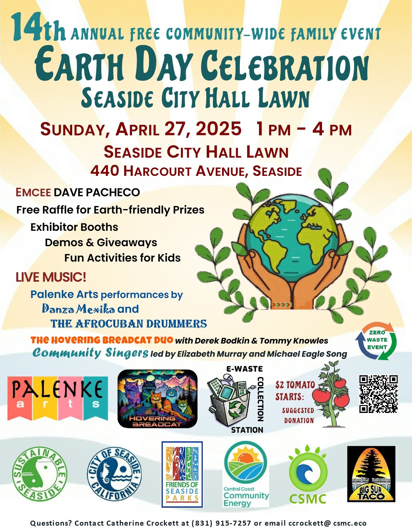 Sustainable Seaside is organizing Seaside's 14th Annual Earth Day Celebration on Saturday, April 27, 2025, from 1 pm to 4 pm on the Seaside City Hall lawn and parking lot, 440 Harcourt Blvd., Seaside, CA.